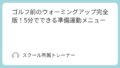 A. 必須ではありませんが、体幹・下半身の筋力があると怪我予防・飛距離UPにつながります。週2〜3回、軽めでOKです。